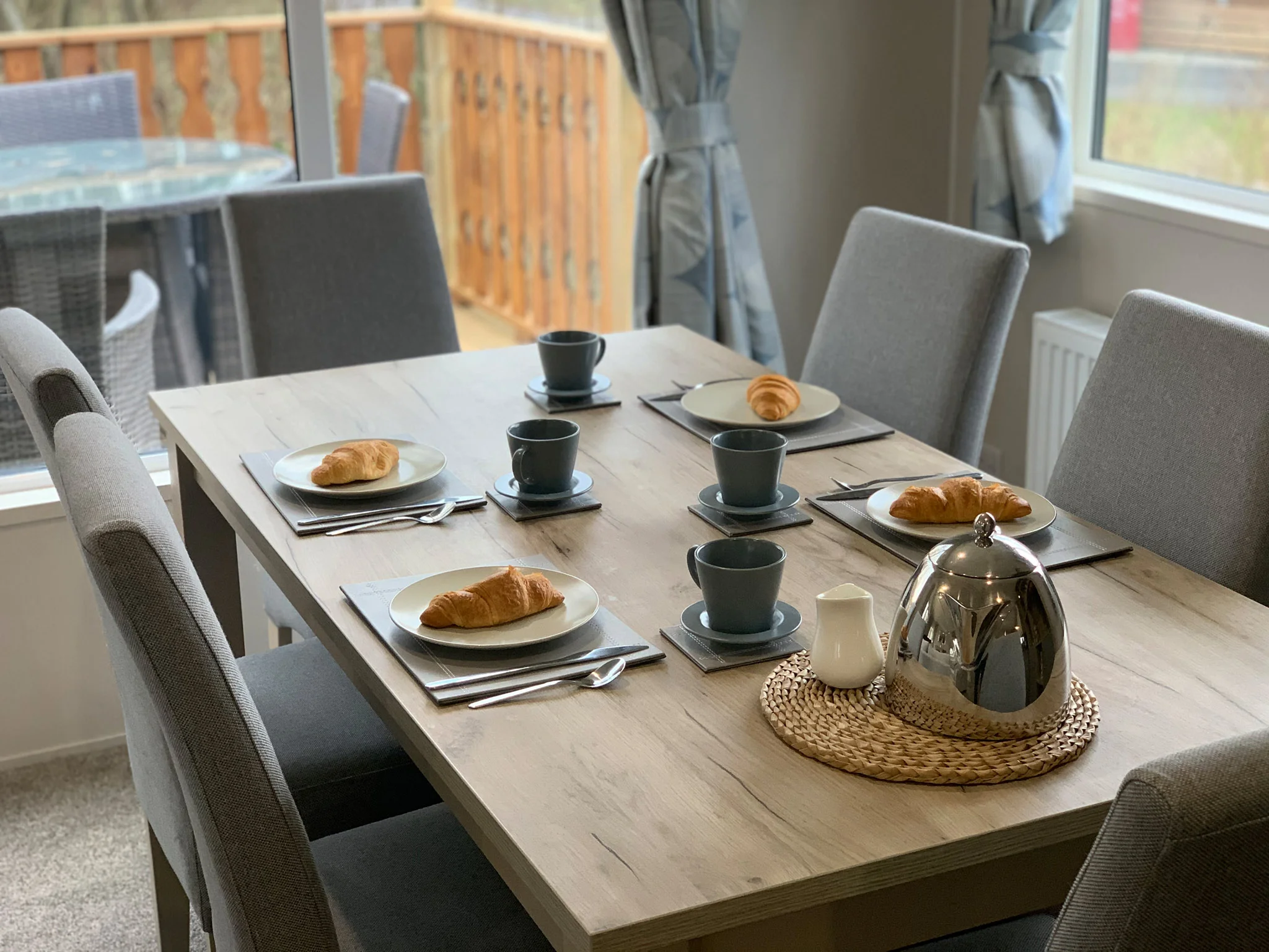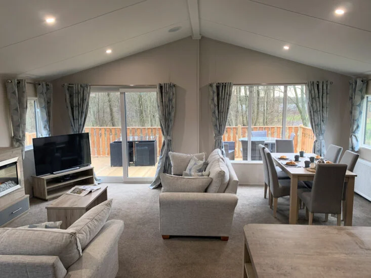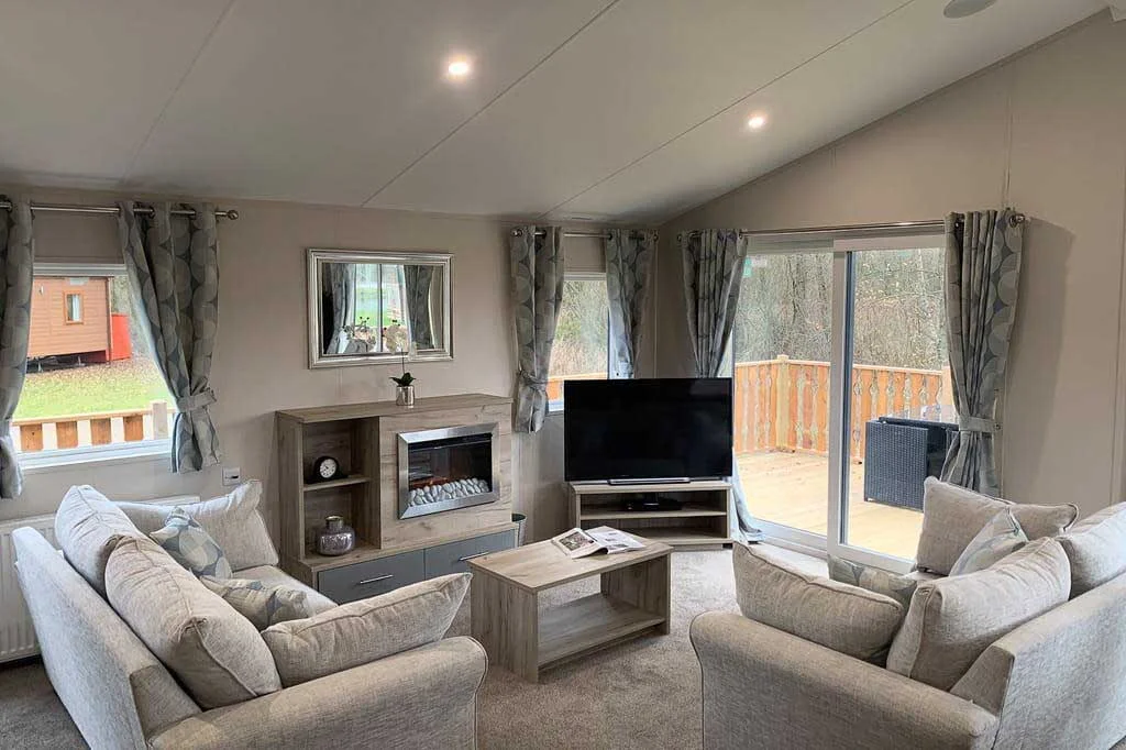 The perfectly located Sherwood 35 lodge in a quiet part of the park which over looks a stream. This lodge is made up of three good sized bedrooms, an en-suite double and two twin rooms, as well as a spacious main bathroom. The lodge is finished to a high standard throughout inclusive of a fully equipped kitchen and extra storage space. Also included is comfy patio furniture on a private balcony as it faces the opposite way to all the others, perfect for relaxing on after a long day. The open plan living and dining area that includes a speaker system in the ceiling and 3 TV’s throughout the lodge makes this the perfect lodge for the whole family.