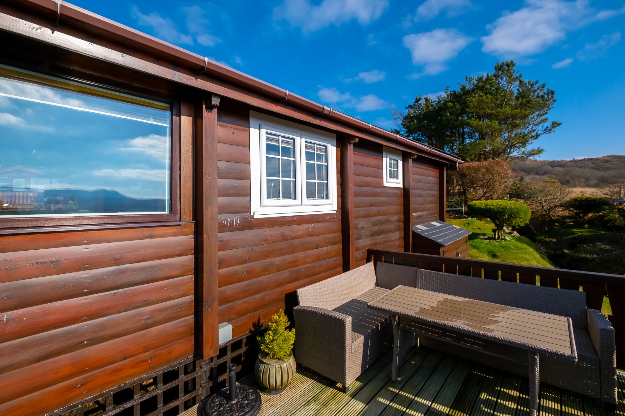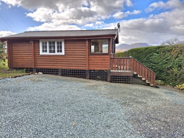 It has a narrow decking to the front with views towards the Rhinog Mountains and a larger private decked area to the southern side of the cabin with uninterrupted views to Cadair Idris. There is a good sized grass area to the side and rear of the cabin and a stream runs along the boundary of the garden. Parking is directly in beside Cabin 254.
