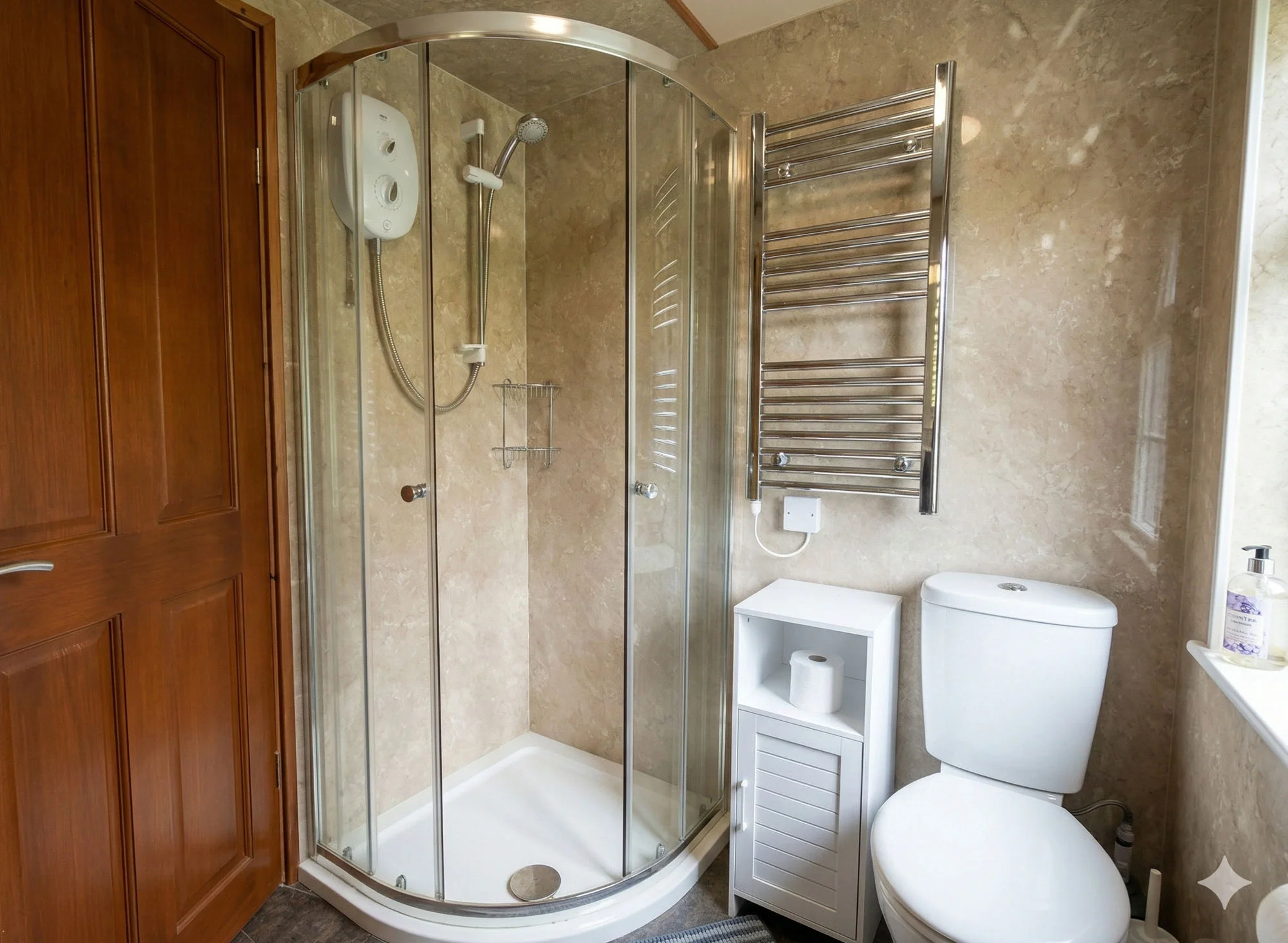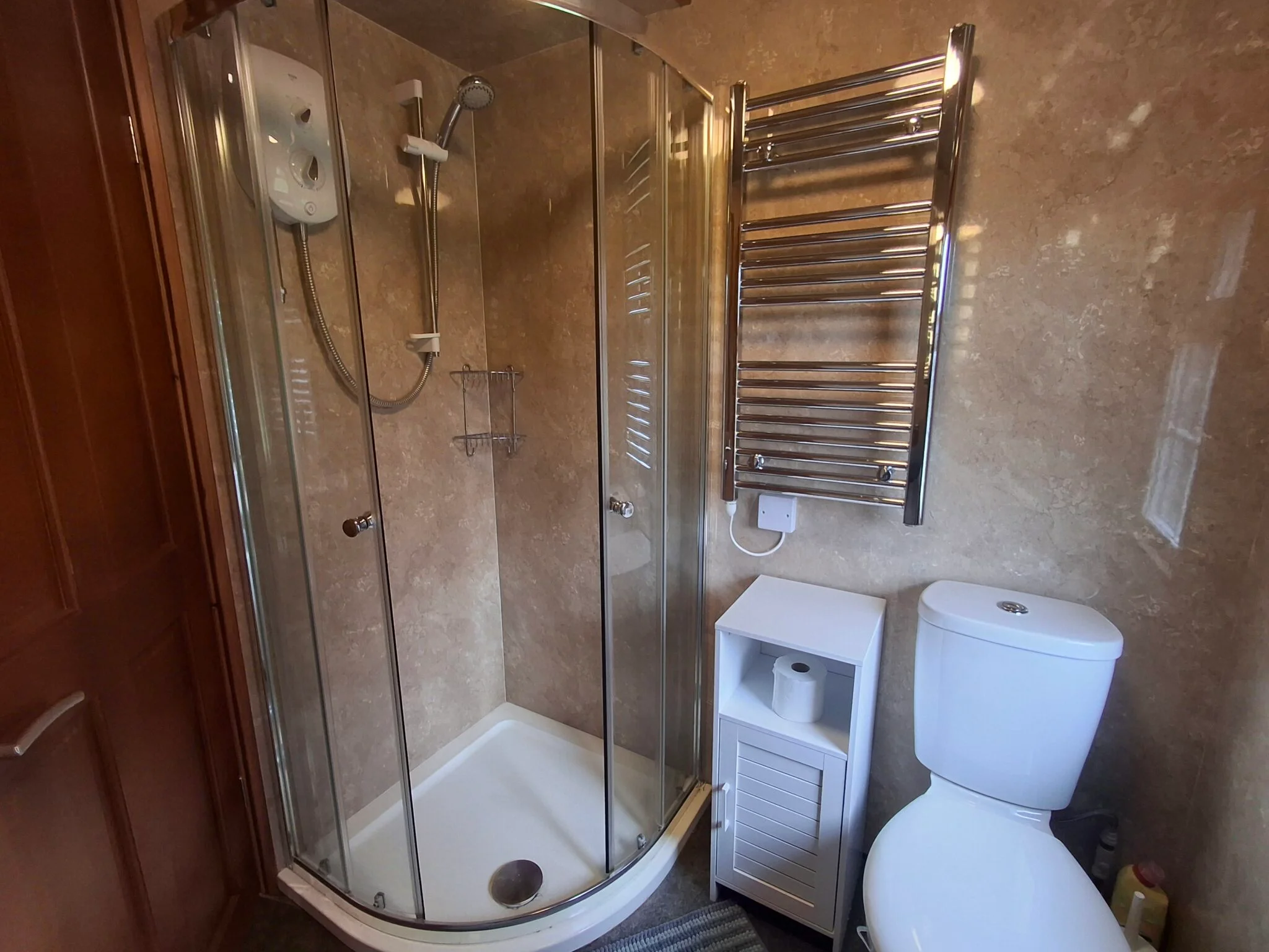The spacious bathroom includes a corner shower, WC and sink with a large mirror above, along with a wall-mounted heated towel rail for added comfort.