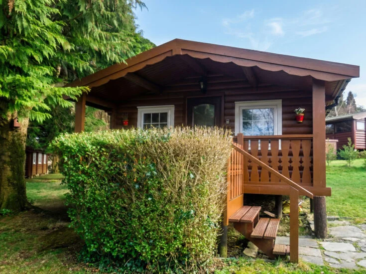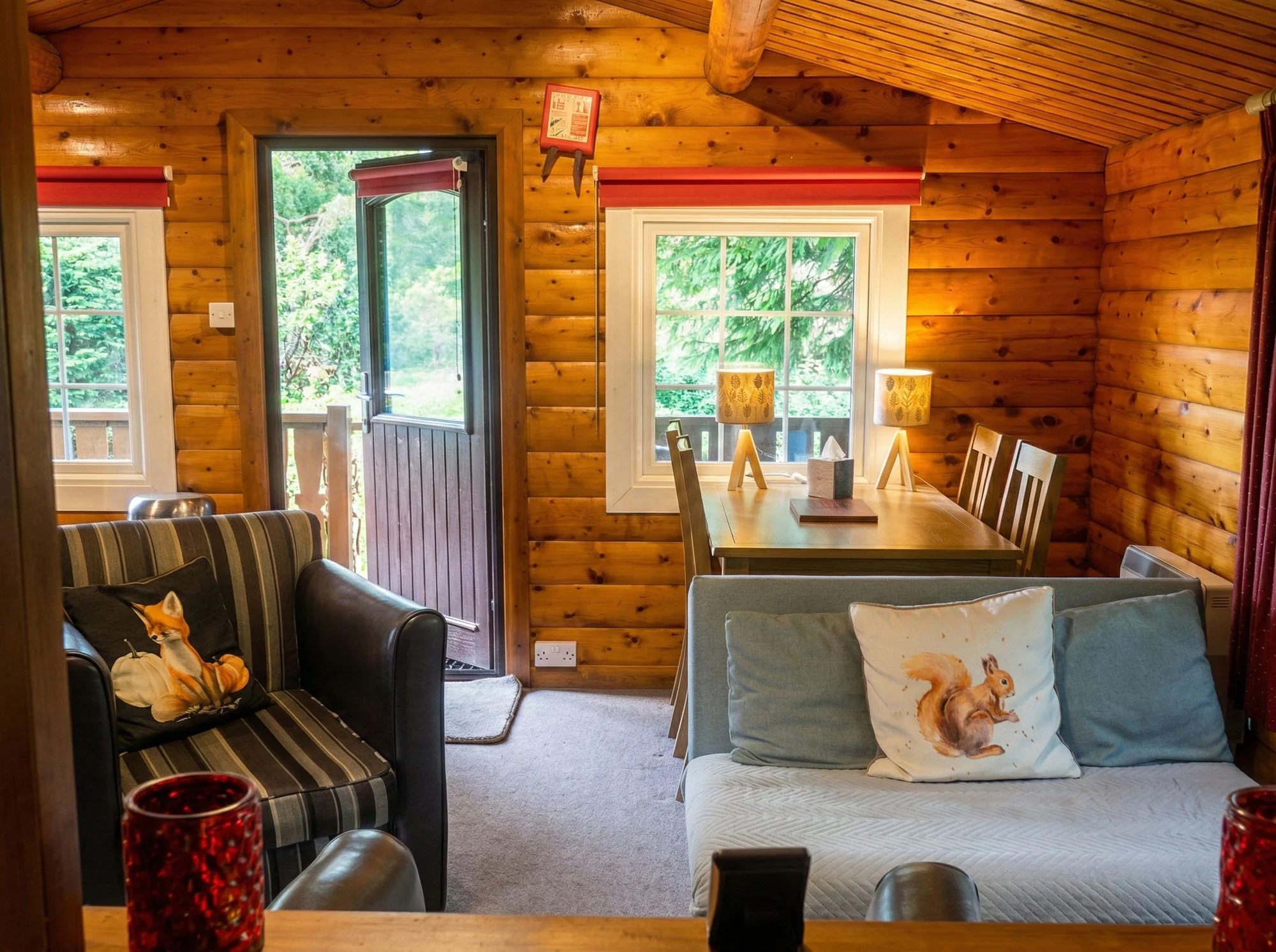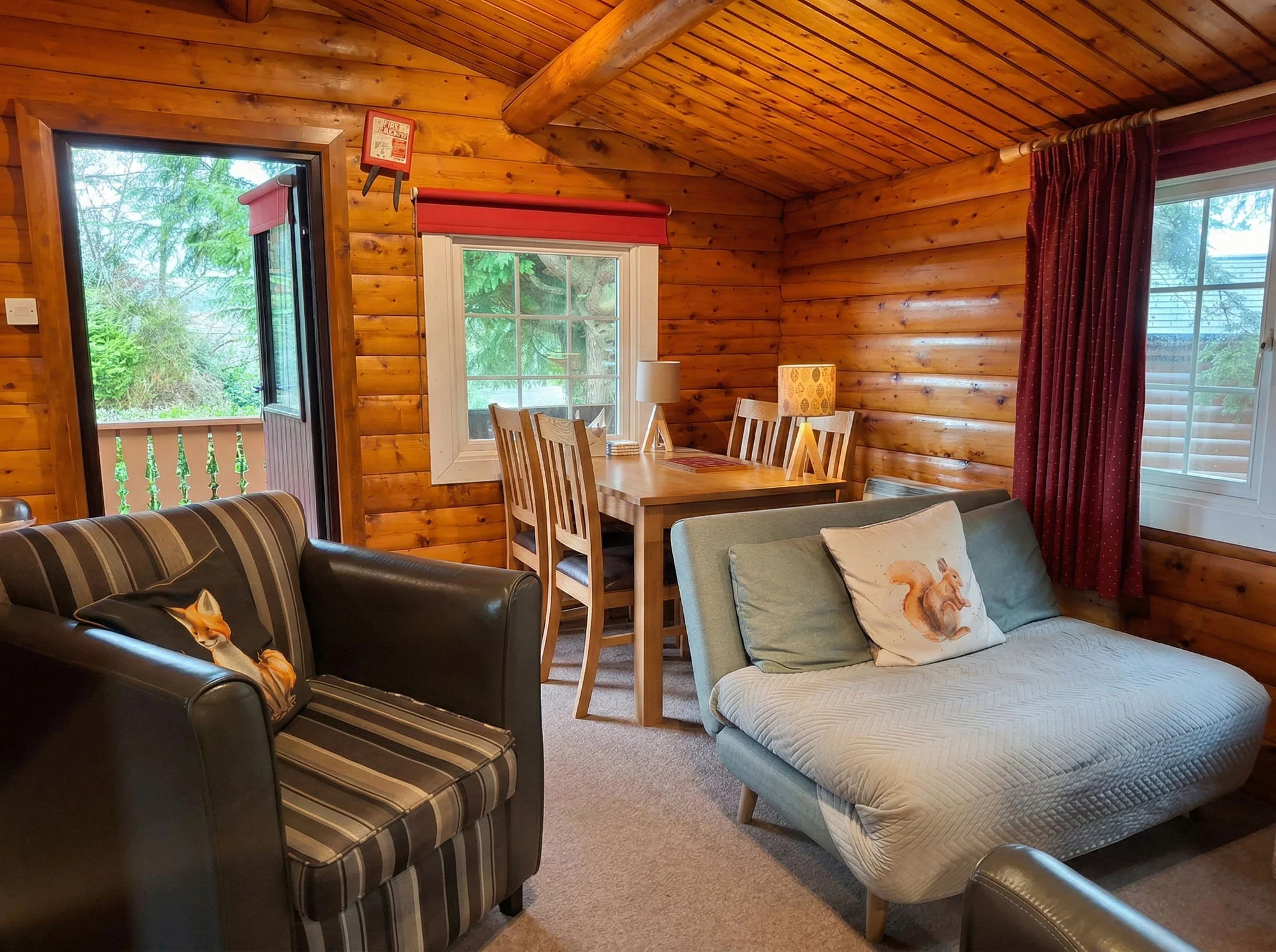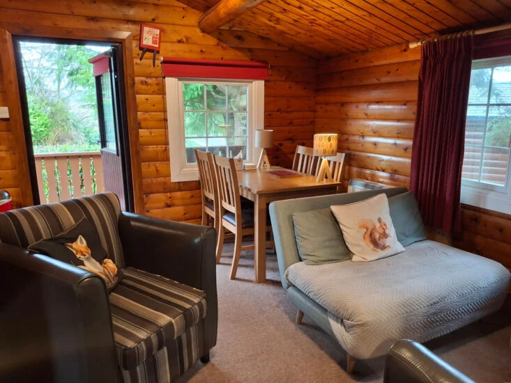 Dog friendly, the cabin also benefits from off-road parking for one large car directly in front. Three steps lead up from the parking area to a gated decking space, complete with a bistro table and chairs, the perfect spot to relax and enjoy partial views towards the mountains. A garden area adds to the outdoor appeal.