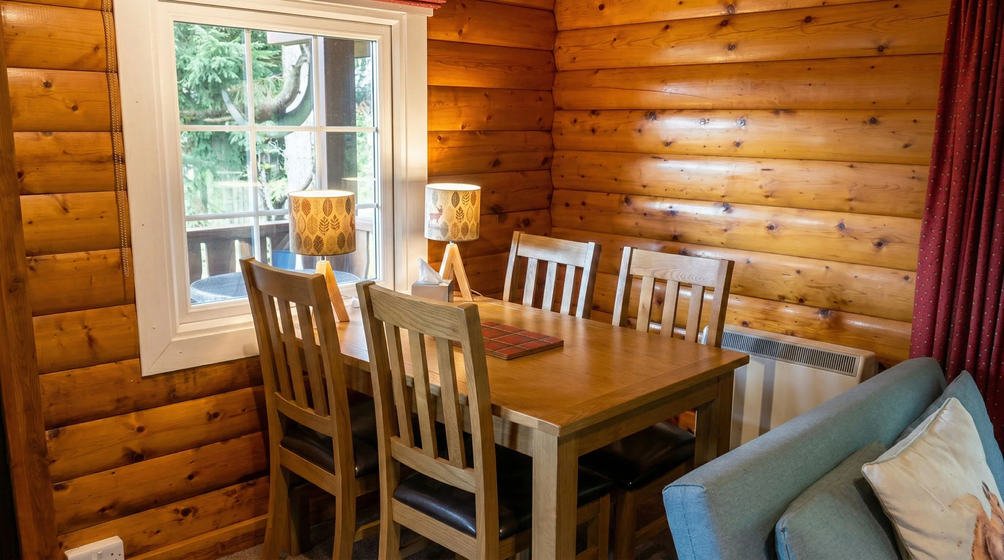 The comfortable living room is carpeted and furnished with two comfy armchairs, a small sofa and a footstool, ideal for relaxing after a day out. There is a TV, table lamps, and blinds and curtains to the windows, creating a warm and homely atmosphere. A dining table with four chairs provides ample space for meals.