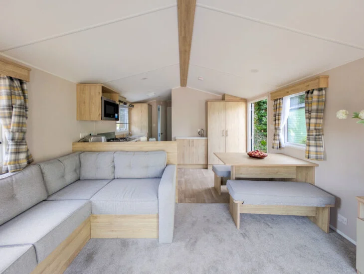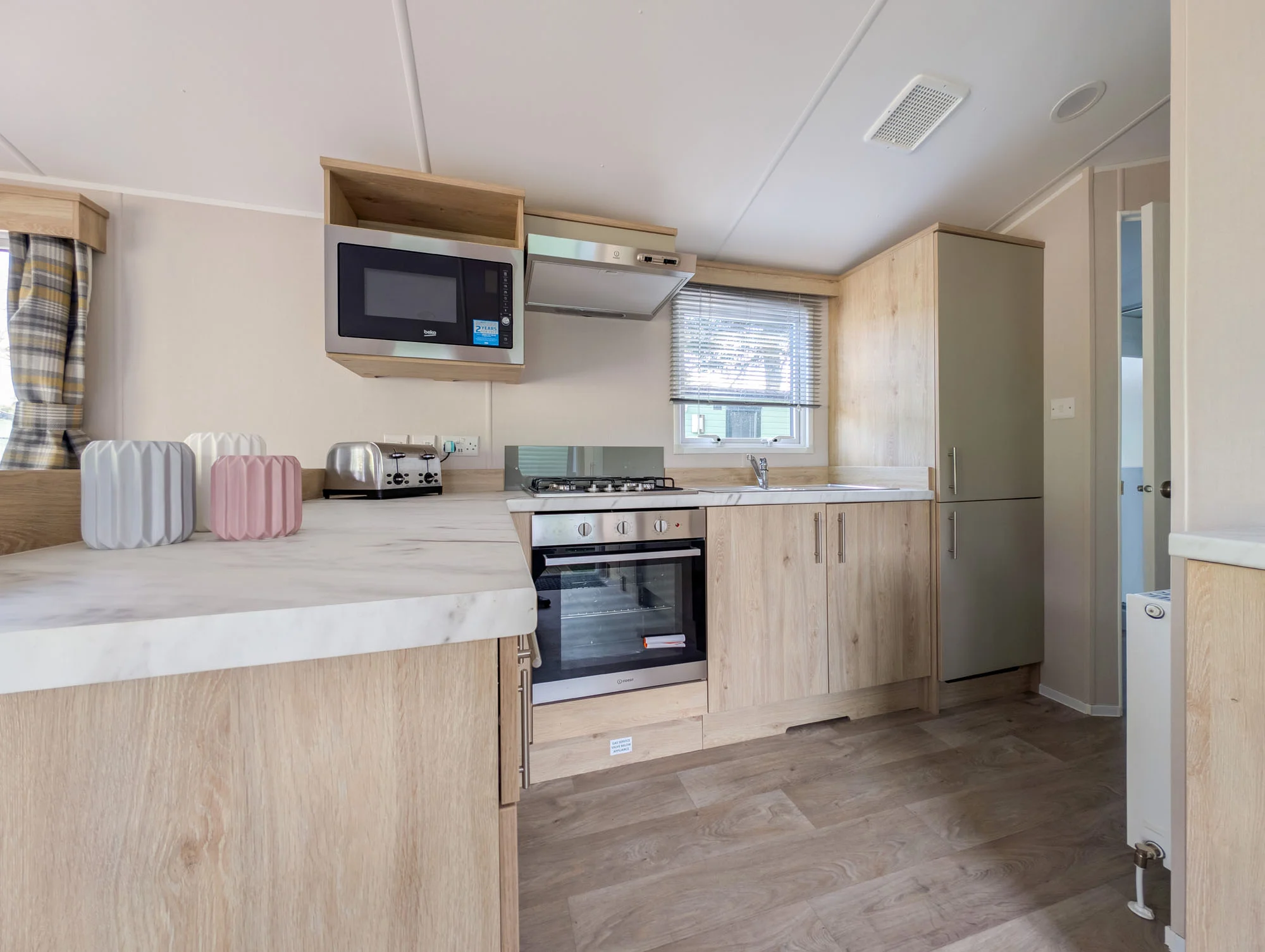 The Atlas Mirage offers a perfect blend of rustic charm and contemporary design, creating a cosy and inviting holiday retreat. This static caravan boasts an open floor plan and large windows that flood the space with natural light. Natural materials like wood accents create a warm and welcoming atmosphere. Modern amenities ensure a comfortable stay. The exterior showcases clean lines and a focus on outdoor living spaces, perfect for enjoying the surrounding nature. Inside, you’ll find spacious rooms with textured materials that add depth and character. The well-appointed kitchen features high-end appliances, making meal preparation a breeze. This holiday home prioritizes comfort and style, offering a relaxing escape for you and your family.